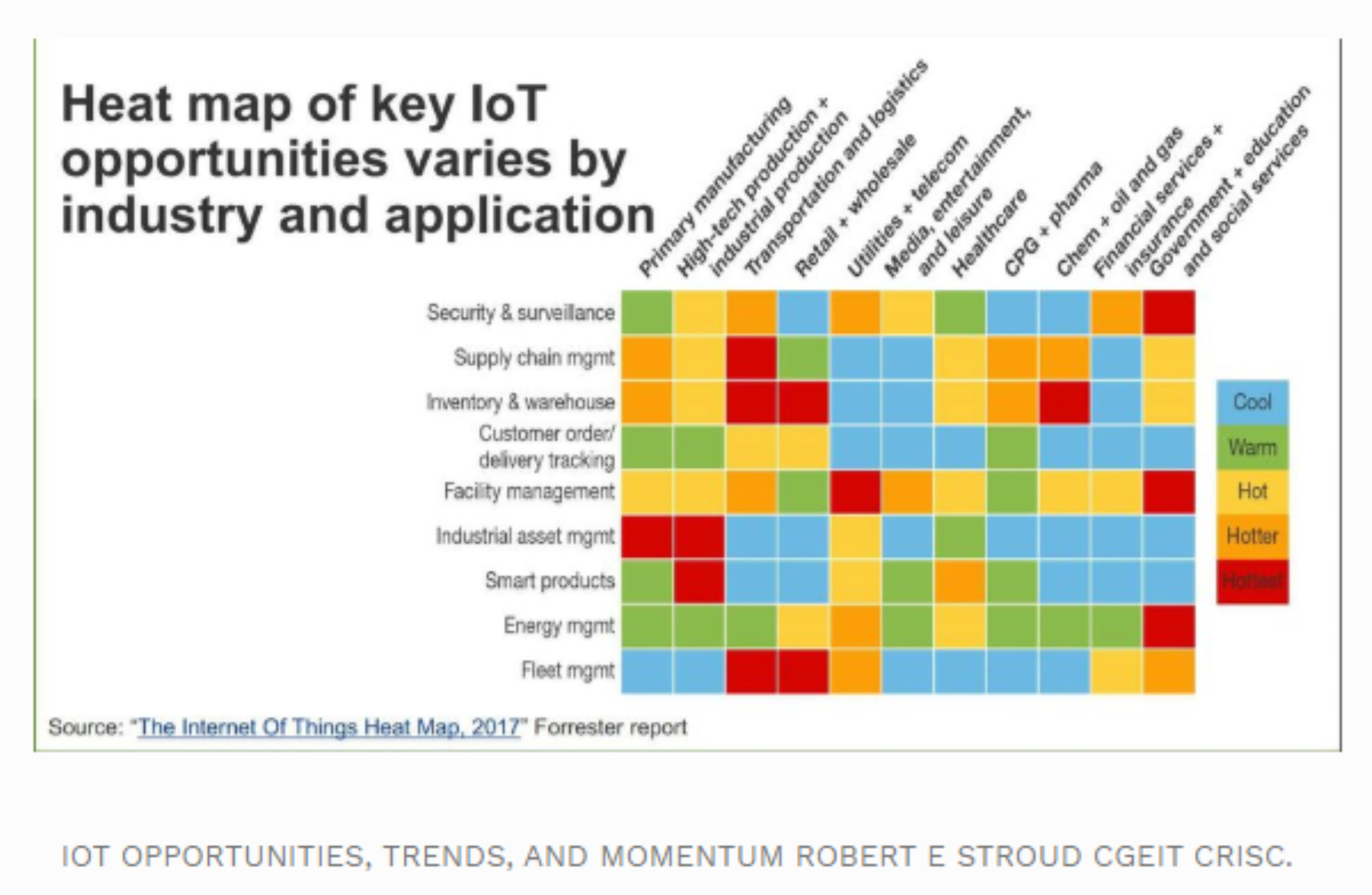 Figure 3, a Forrester heat map, shows the fastest growing areas of IoT adoption by industry and application.