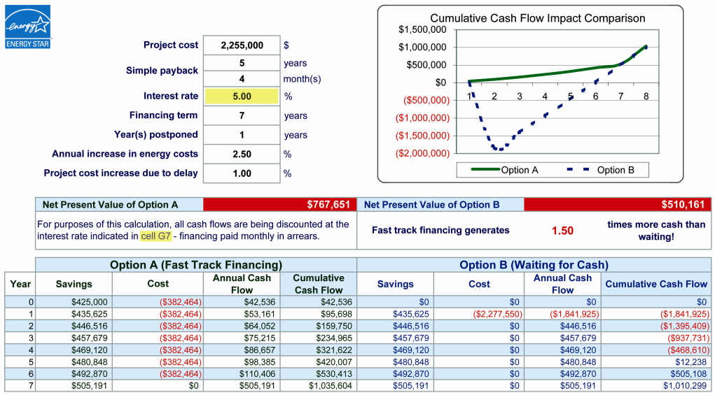 A while back, we made the “see how much money you are leaving on the table” argument to the chief financial officer of a large city in the Northeast on behalf of the local electric utility. The CFO responded that the city was fiscally conservative, and officials believed that waiting until funds were available in a future operating budget (thereby avoiding borrowing and paying interest) was in the best interests of the city. We used the CFO Calculator to map the cash-flow consequences of two decision points (financing now or waiting until a future budget) to demonstrate to the city’s CFO and town council that financing now was a better financial decision than waiting for cash.