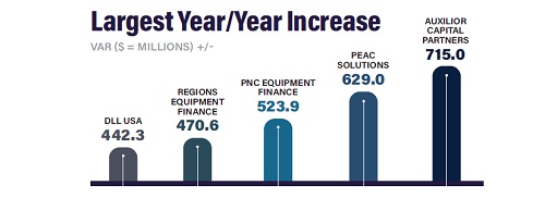 PEAC Solutions followed closely, making its official entrance into the top 10 with a $629 million (113%) year-over-year gain, reinforcing its formidable presence in a rapidly evolving vendor finance landscape. PNC Equipment Finance, meanwhile, notched the third-largest absolute gain at $523.9 million, keeping its No. 4 position intact.