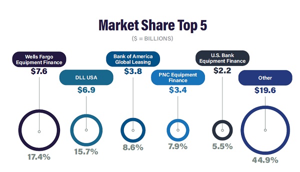 Wells Fargo Equipment Finance claimed the No. 1 position from DLL USA, closing 2024 with $7.6 billion in vendor volume despite a 7.4% decline from the previous year. After restating its volume to align with ELFA reporting, DLL USA dropped to second with $6.9 billion, still up 6.9% year over year. Rounding out the top five were Bank of America Global Leasing ($3.8 billion), PNC Equipment Finance ($3.4 billion) and U.S. Bank Equipment Finance ($2.4 billion).