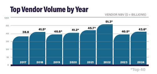 The overall Top 40 vendor volume increased from $40.5 billion in 2023 to $43.6 billion in 2024 — a year-over-year growth of $3.1 billion (7.7%).