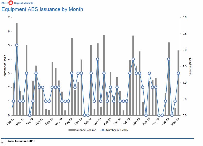 So far, the second quarter has been more active, with four equipment ABS deals coming to market. In April, Ascentium Capital came to market with a $237 million deal. May has seen three new deals, including a $787 million large-ticket deal from MassMutual Asset 100Finance, a $343 million small-ticket deal from LEAF Commercial Capital and an $862 million deal from CNH Industrial. This was the second 2016 transaction for CNH, backed by mid-ticket assets such as agricultural and construction equipment.
